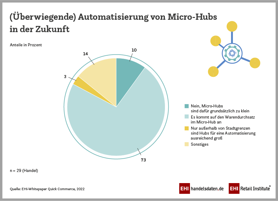 Im Hinblick auf die Frage der Automatisierung von Micro-Hubs zeigen sich die Händler optimistisch – solange der Warendurchsatz stimmt. Für 73 Prozent sind automatische Micro-Hubs sinnvoll, wenn ein bestimmter Warendurchsatz erreicht wird. Zehn Prozent halten Micro-Hubs grundsätzlich für zu klein für eine Automatisierung.