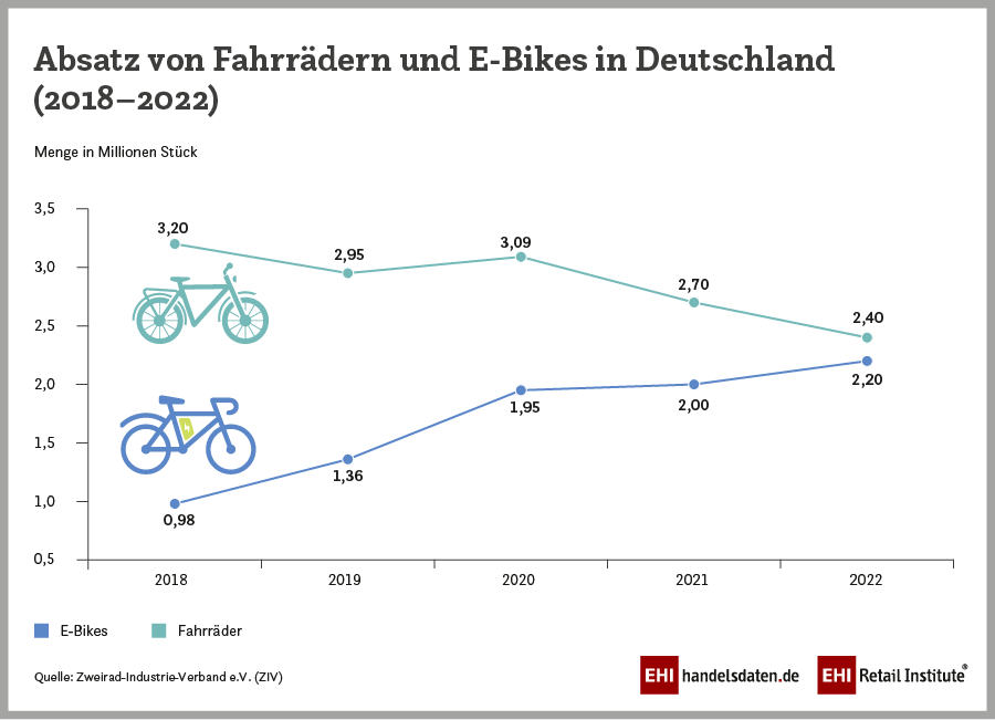 Immer mehr E-Bikes sind auf Deutschlands Straßen unterwegs. So zeigt die kostenlose Infografik aus unserem EHI-Newsletter, dass die Deutschen im vergangenen Jahr 2,2 Millionen E-Bikes gekauft haben – nur 0,2 Millionen weniger als herkömmliche Fahrräder. Gegenüber dem Vorjahr ist die Zahl damit um zehn Prozent gestiegen. Das rasante Wachstum des Marktes setzt sich damit weiter fort. In diesem Jahr könnten erstmals mehr E-Bikes als Fahrräder verkauft werden.
