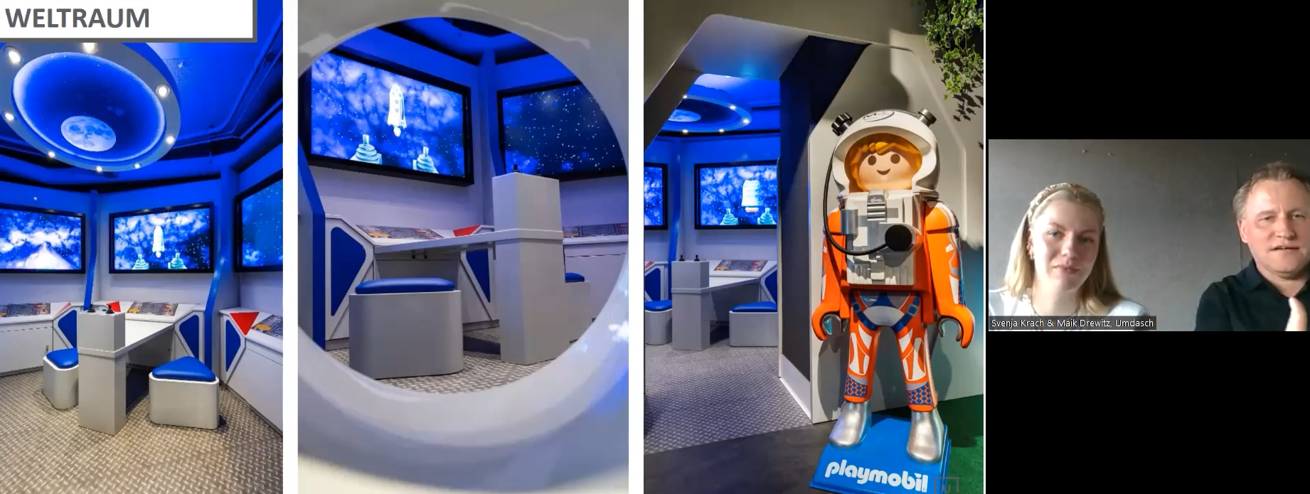 Maik Drewitz und Svenja Krach von Umdasch stellten vor, wie der Spielwarenladen „Puppenkönig“ in der Bonner Innenstadt mithilfe technischer Elemente in eine moderne Playmobil-Erlebniswelt verwandelt wurde. Dort können Kinder neben der klassischen Betrachtung der Playmobil-Spielwaren auch in eine Erlebniswelt eintauchen, bei der interaktive Erlebnisse entstehen. Hierbei wurden Elemente wie Digital Signage, Selfie-Points, Augmented Reality oder Gamification in das Gesamtkonzept integriert.