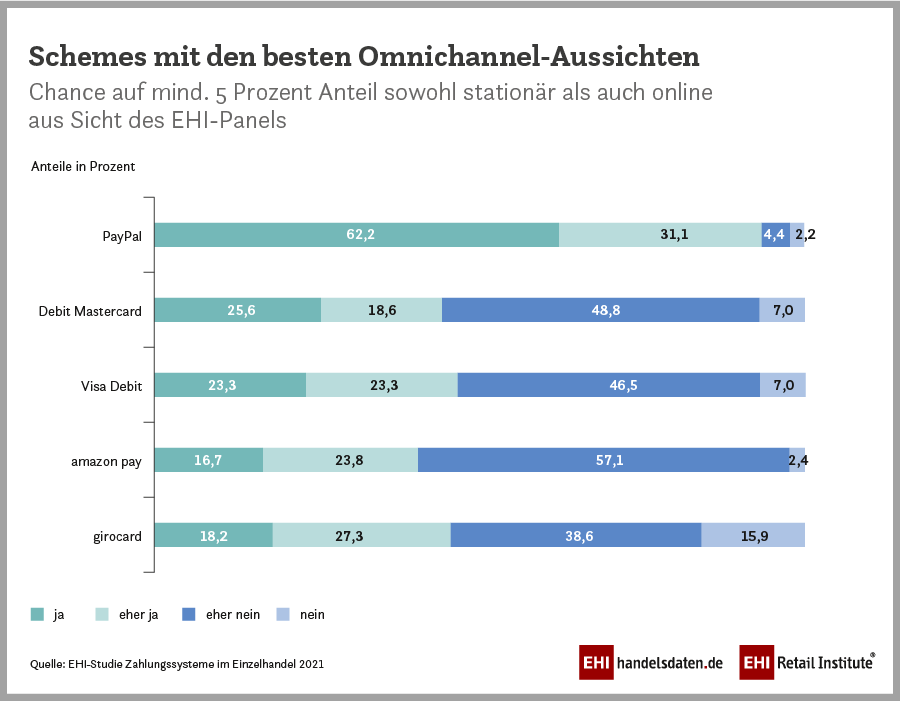 Das ursprünglich für das reine Online-Geschäft konzipierte PayPal, mit 24,9 Prozent Anteil nach Rechnung/Überweisung die Nr. 2 der Online-Bezahlarten, kommt im Gesamtkuchen immerhin bereits auf einen Anteil von 3,7 Prozent. Dieser Wert dürfte sich in den kommenden Jahren deutlich nach oben bewegen. So halten 9 von 10 Handelsunternehmen im EHI-Panel PayPal für das System mit der besten Omnichannel-Fähigkeit, noch deutlich vor den beiden neuen Produkten von Visa und MasterCard und auch deutlich vor dem ähnlich strukturierten Wettbewerbsprodukt amazon pay. Schon jetzt kann Paypal in einigen Mobilbezahlsystemen für den stationären Einsatz als präferierte Bezahlart hinterlegt werden.
