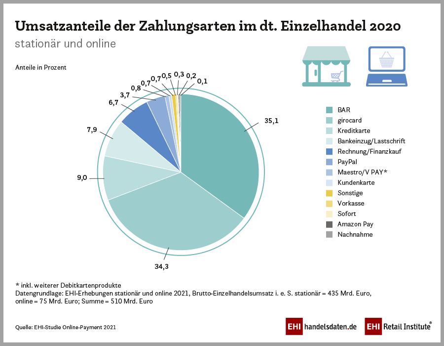 Die beiden marktführenden Zahlungssysteme des stationären Einzelhandels, die Barzahlung mit einem Umsatzanteil von 40,9 Prozent (minus 5,6 Prozentpunkte gegenüber 2019) und die girocard mit einem Anteil von 40,1 Prozent (plus 6,5 Prozentpunkte) haben online keine Bedeutung.