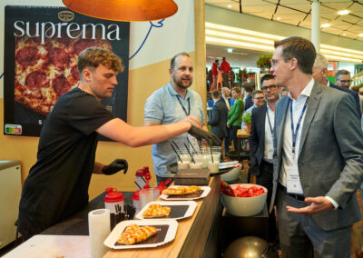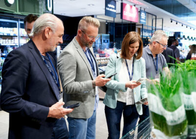 Höhepunkt der Veranstaltung war der Besuch von drei Supermärkten und der hauseigenen Manufaktur der Gastgeberfamilie Schenke. In der anschließenden Manöverkritik wurde in großer Runde über das Gesehene diskutiert. Es gab viel Lob, viele Fragen und wenig kritische Töne. Der Austausch durfte natürlich insgesamt nicht zu kurz kommen. Auf Einladung von Dr. Oetker trafen sich die Gäste zu einer fulminanten Abendveranstaltung in der Oetker Welt und am letzten Abend gab es die traditionelle Abschlussparty auf der Tenne der Klosterpforte in Harsewinkel. Mit dabei die Sazerac Seingers und MLF-DJ Jacob Lorenz Wehrmann.