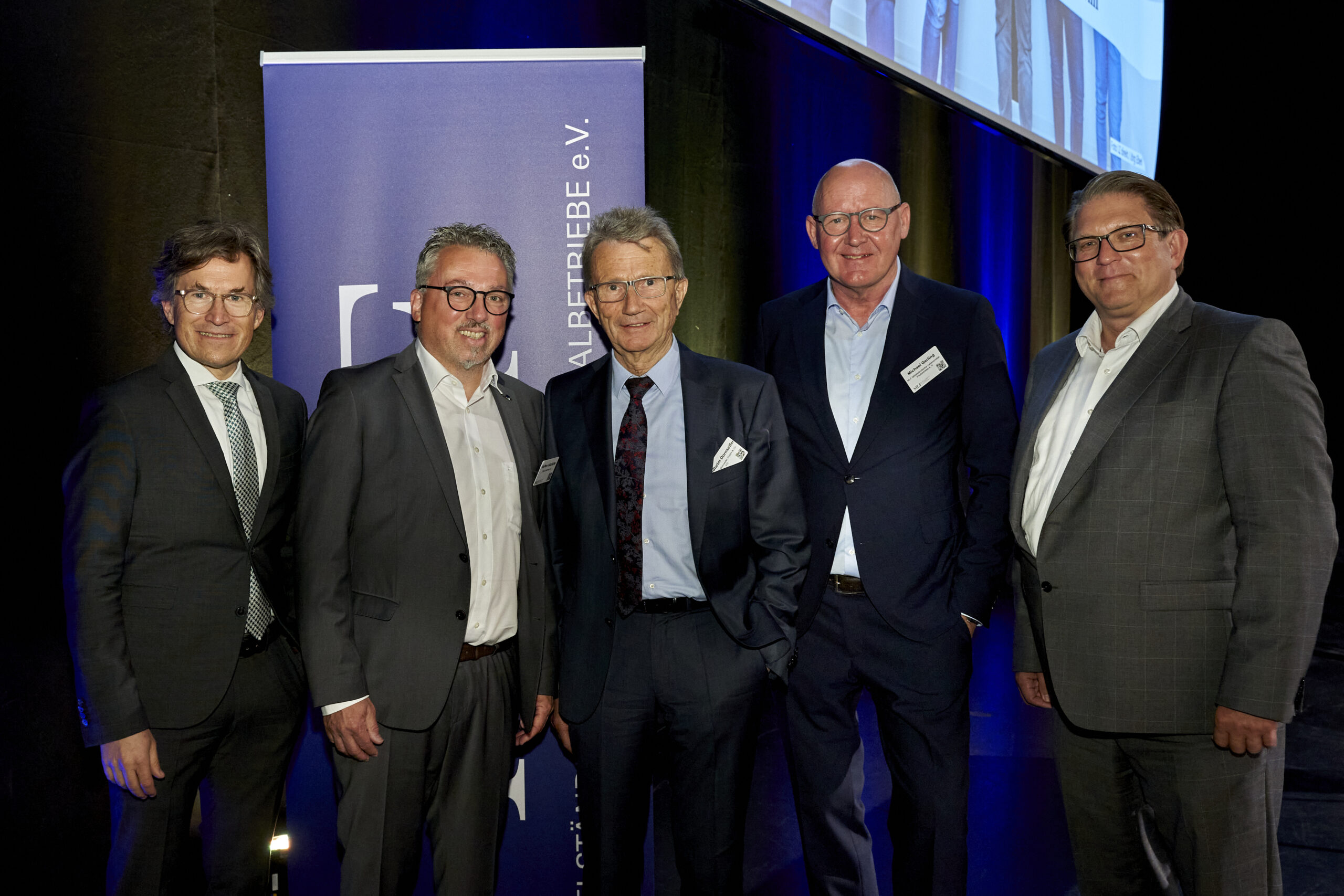 Edeka-Chef Markus Mosa, Gastgeber Steffen Ueltzhöfer, MLF-Präsident Friedhelm Dornseifer, EHI-Geschäftsführer Michael Gerling und Uwe Kohler, Aufsichtsratsvorsitzender Edeka Südwest (v. l. n. r.), Foto: Rosendahl