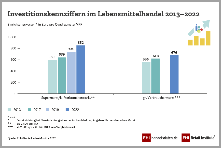 Der Lebensmittelhandel investierte 2022 für einen neuen Markt bis 2.500 qm Verkaufsfläche (VKF) 852 Euro pro Quadratmeter VKF. Für größere Märkte ab 2.500 qm VKF belaufen sich die Ausgaben für einen neuen Markt auf 676 Euro/qm VKF. Für den klassischen Supermarkt ist dies eine Steigerung von 16 Prozent innerhalb der letzten drei Jahre, für die größeren Märkte liegt kein Vergleichswert vor. Neben konzeptbedingten Aufwendungen für ein hochwertiges Ladenbild bleibt die Kältetechnik der größte Kostentreiber, getrieben durch mehr Verbrauchsträger und eine forcierte Umrüstung auf energieeffiziente Technik und natürliche Kältemittel.