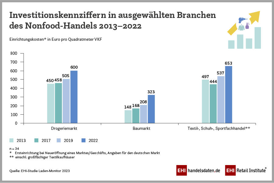 Auch im Textil-, Schuh- und Sportfachhandel sind die Einrichtungskosten mit einem Plus von 22 Prozent weiter gestiegen auf 653 Euro/qm VKF. Unverändert prägen eine hochwertige Ladenoptik und detailreiche Wareninszenierung das Store-Design. Denn die wenigen neuen Läden in dieser Branche sollen etwas Besonderes sein, um für Aufmerksamkeit bei der Kundschaft zu sorgen. Auch in anderen Branchen des Nonfood-Handels sind die Kosten je nach Investitionsbereich und eingesetztem Material zwischen 20 und vereinzelt bis zu 50 Prozent gestiegen, nicht zuletzt aufgrund der massiven Preissteigerungen an den Beschaffungsmärkten.