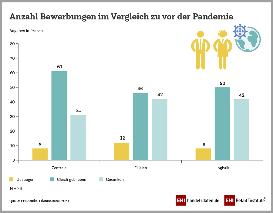 Eine starke Rolle bei der Besetzung von Arbeitsplätzen hat zuletzt auch die Corona-Pandemie gespielt. Je 42 Prozent der Befragten in den Bereichen Filialen und Logistik sagen, dass Bewerbungen im Vergleich zu vor der Pandemie abgenommen haben. Im Bereich Zentrale geben dies fast ein Drittel an (31 Prozent). Dabei erklärt mehr als die Hälfte (54 Prozent), dass der Bedarf an Mitarbeitenden in der Corona-Zeit gestiegen ist. Eine Erklärung für fehlendes Personal könnte das verschlechterte Image einzelner Branchen während der Pandemie sein. Für 58 Prozent der Recruiter hat das Image von Kauf- und Warenhäusern durch lange Schließungen der Läden und der damit verbundenen Unsicherheit (u. a. Kurzarbeit, Verlust des Arbeitsplatzes) gelitten. Für die Branche Mode & Accessoires sehen dies sogar 61 Prozent. Als Gewinner eines verbesserten Images sehen die Personalverantwortlichen die in der Corona-Zeit stets geöffneten Lebensmittelhändler (54 Prozent) sowie Baumärkte und Einrichtungshäuser (46 Prozent).