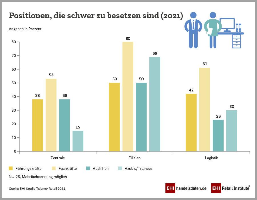 Filialen haben im Vergleich zur Logistik und Zentrale den größten Personalmangel zu verzeichnen, weil in diesem Bereich die meisten Mitarbeitenden gebraucht werden. Dabei sind Positionen für Fachkräfte über alle Bereiche hinweg die am schwersten zu besetzenden Stellen. 80 Prozent der Personalverantwortlichen geben bei Filialen an, Schwierigkeiten zu haben, geeignetes Fachpersonal zu finden. In der Logistik und Zentrale sind es 61 bzw. 53 Prozent. In den Filialen ist auch die Besetzung von Ausbildungsplätzen für 69 Prozent ein größeres Problem. In der Logistik und Zentrale sieht es mit 30 bzw. 15 Prozent etwas entspannter aus.