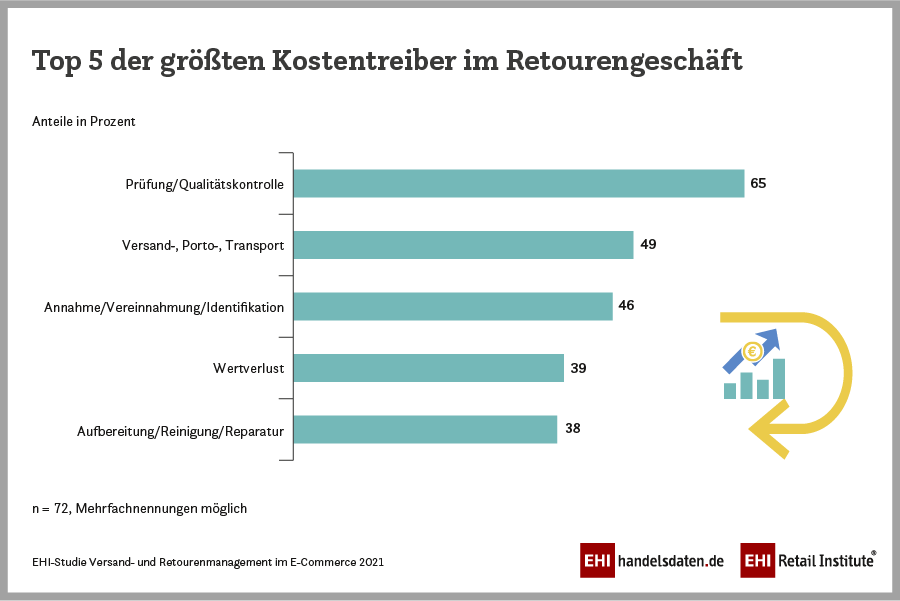 Als größte Kostentreiber im Retourengeschäft beurteilen nahezu zwei Drittel (65 Prozent) der befragten Onlinehändler die Prüfung, Sichtung und Qualitätskontrolle der Artikel. 49 Prozent bewerten die Versand- bzw. Porto- und Transportkosten der retournierten Artikel als entscheidende Kostentreiber. Einen nicht zu unterschätzenden Kostenblock bilden auch alle physischen Prozesse, die mit der Rücknahme von Retouren verbunden sind. Hierzu zählen Annahme, Vereinnahmung und Identifikation (46 Prozent), Aufbereitung, Reinigung und Reparatur (38 Prozent) sowie die Wiedereinlagerung der Artikel (32 Prozent).