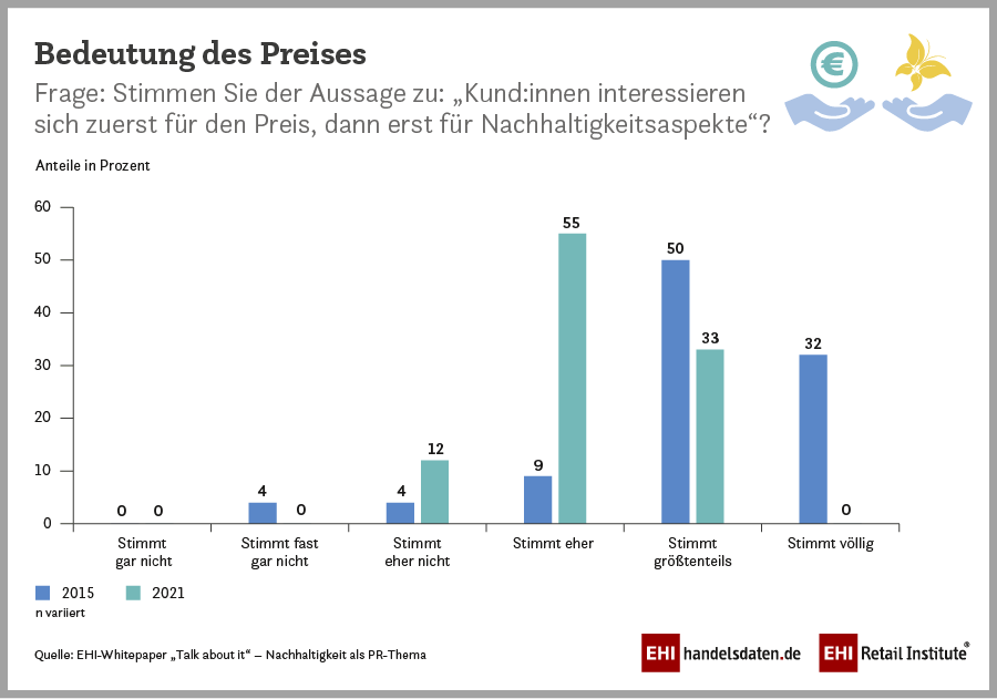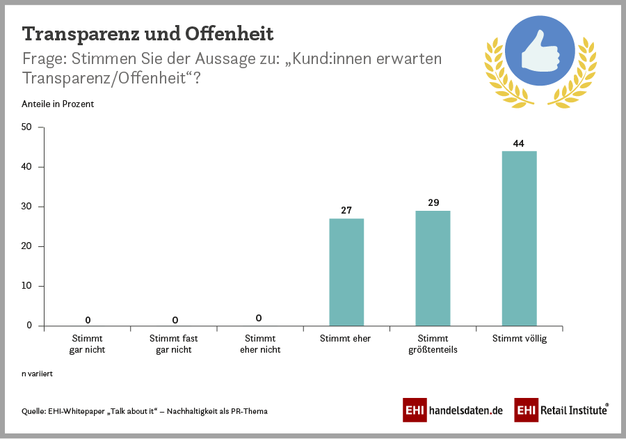 „Nachhaltigkeitsthemen geben der Kundschaft ein gutes Gefühl und sind aus der Unternehmenskommunikation nicht mehr wegzudenken – auch wenn sie Kritiker:innen immer wieder eine Angriffsfläche bieten. Die Kundenerwartung ist eindeutig“, so Ute Holtmann, Leiterin PR beim EHI. In 2015 waren 84 Prozent der PR-Verantwortlichen der Meinung, dass Nachhaltigkeit in den nächsten Jahren an Bedeutung gewinnen wird. Heute stimmen dieser Aussage alle Befragten zu. Denn immer mehr Kundinnen und Kunden erwarten, dass die Unternehmen, die sie mit ihren Einkäufen unterstützen, nachhaltig agieren. Auch der Gesetzgeber formuliert mehr Forderungen nach umwelt-, tier- und sozialverträglicher Produktion, wie das Beispiel Lieferkettengesetz zeigt. Nachhaltige Aktivitäten zu kommunizieren, stärkt das Vertrauen in das Unternehmen, davon sind 47 Prozent überzeugt. Weitere 50 Prozent glauben tendenziell an diese Wirkung.