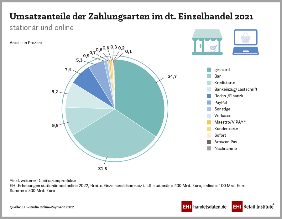 Aufgrund der zunehmenden Bedeutung des Online-Handels ergeben die stationär und online erzielten Umsatzanteile der Zahlungsarten zusammen in der Hochrechnung für den gesamten Handel* ein neues Bild für 2021. Dafür wurde der stationäre Einzelhandelsumsatz auf 430 Mrd. Euro brutto (Minus von rund 5 Mrd. Euro zu 2020) und der E-Commerce Umsatz auf 100 Mrd. Euro brutto (Plus von rund 20 Mrd. Euro zu 2020) berechnet. In der Gesamtbetrachtung löste der stationäre Marktführer girocard (34,7 Prozent) den Bargeldanteil (31,5 Prozent) ab. Dahinter folgten die Kreditkarte (9,5 Prozent) und das Lastschriftverfahren/Bankeinzug (8,2 Prozent). Paypal kam erstmals mit 5,3 Prozent über die signifikante Fünf-Prozent-Schwelle.