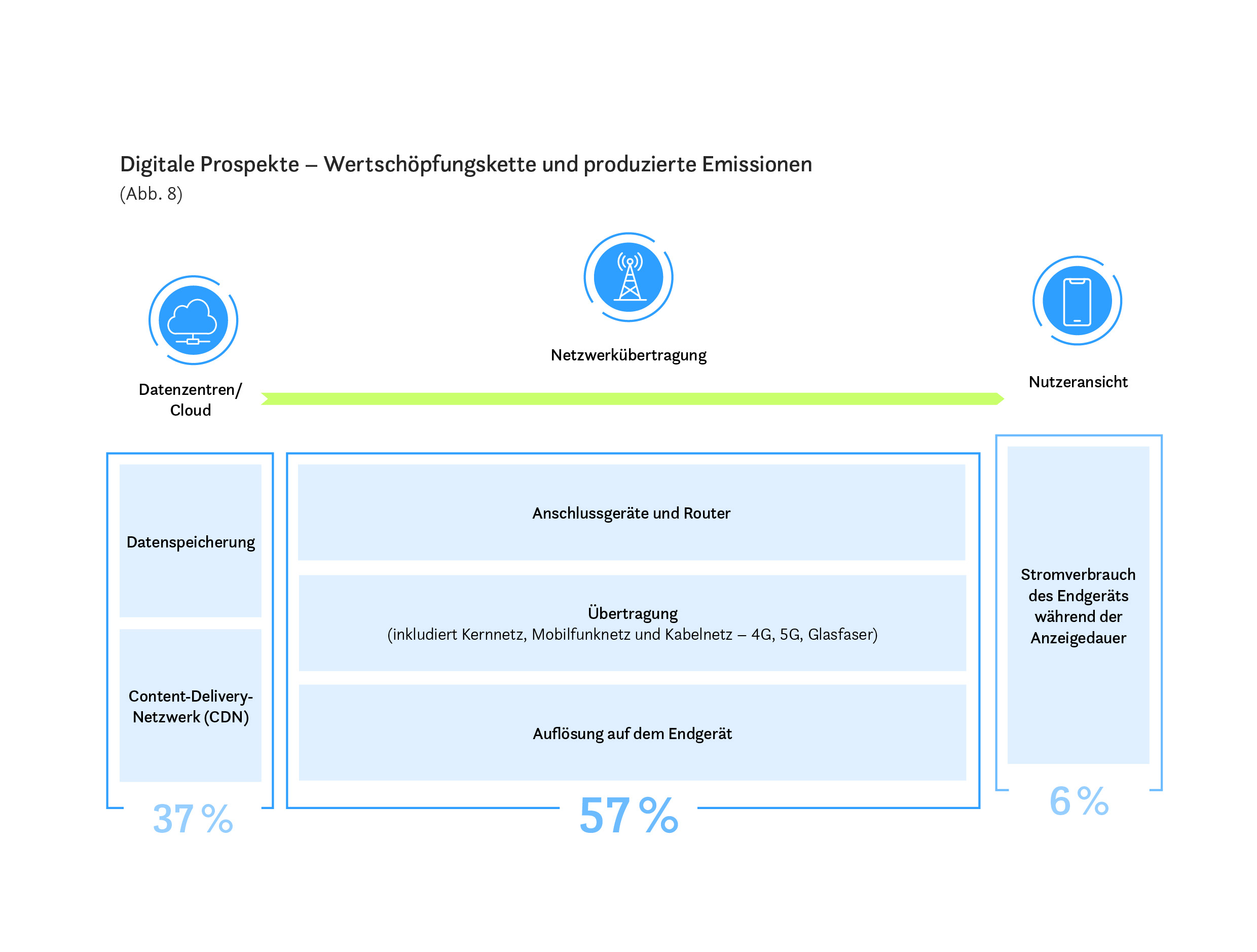 Ein gleich umfangreicher digitaler Prospekt über eine App nutzt die meiste Energie für die Netzwerkübertragung*. 57 Prozent verbrauchen Anschlussgeräte/Router, die Übertragung und die Auflösung auf dem Endgerät. Die Datenspeicherung in der Cloud macht 37 Prozent aus. Der Stromverbrauch des Empfängergeräts fällt nur mit sechs Prozent ins Gewicht. Die effizienteste Maßnahme zur Reduktion der Emissionen ist die Datenkomprimierung bzw. -optimierung. Das so genannte Lazy Loading, bei dem Daten erst dann heruntergeladen werden, wenn sie tatsächlich benötigt werden, reduziert den Datenverkehr und damit den Energieverbrauch. Ähnlich verhält es sich bei Videos in den sozialen Medien. Der größte Teil des CO2-Ausstoßes für ein acht Sekunden langes Bewegtbild in den sozialen Medien entsteht ebenfalls hauptsächlich durch Netzwerkübertragung.