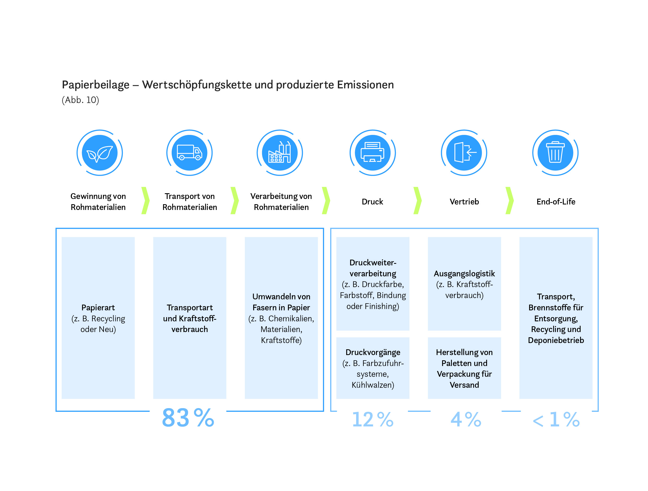 Anhand der folgenden Beispiele gibt der Leitfaden Empfehlungen für Einsparmöglichkeiten der klimaschädlichen Emissionen bei unterschiedlichen Werbemaßnahmen. Für eine 16-seitige Printbeilage in DinA4 fließen 83,4 Prozent der Emissionen in den Transport und Verarbeitung des Papiers. Die restlichen Anteile entfallen auf Druck, Vertrieb und Entsorgung. Deshalb liegt der größte Hebel in einer nachhaltigeren Materialbeschaffung. Dazu gehört ein hoher Recycling-Anteil des Papiers oder ein ressourcenschonender Transport. Letzteres ließe sich allein durch die Vermeidung von Leerfahrten der LKW erreichen. Auch alternative Materialien wie Hanf statt Holz sind zu empfehlen.
