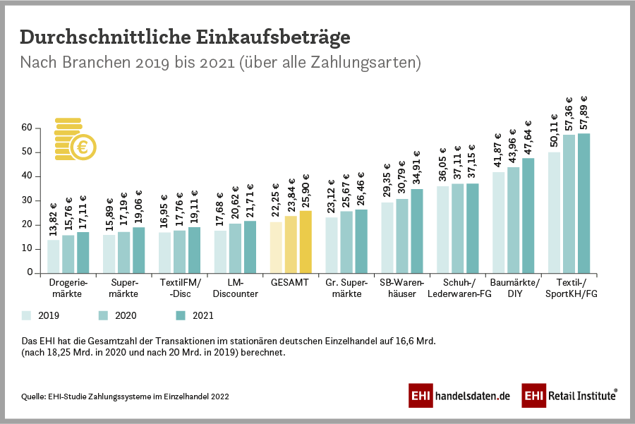 Gestiegen ist dagegen der durchschnittliche Einkaufsbetrag im deutschen Einzelhandel. Der Durchschnittsbon lag 2021 bei 25,90 Euro (Vorjahr: 23,84 Euro) und hat sich damit innerhalb von zwei Jahren um 16 Prozent erhöht, während der gesamte stationäre Umsatz 2021 von 435 Mrd. Euro auf 430 Mrd. Euro geschrumpft ist. Aufgrund der Kontaktbeschränkungen ging der Trend dahin, den Handel deutlich weniger aufzusuchen, dann aber erheblich mehr einzukaufen und gleichzeitig einen wesentlichen Anteil der Einkäufe außerhalb des täglichen Bedarfs online zu tätigen. Dies hat die Zahl der Einkäufe binnen zwei Jahren von 20 Mrd. auf 16,6 Mrd. schrumpfen lassen. Gleichzeitig ist nach ersten Berechnungen des EHI der Online-Umsatz (brutto) in diesen zwei Jahren von rund 60 Mrd. Euro auf mindestens 100 Mrd. Euro gestiegen.