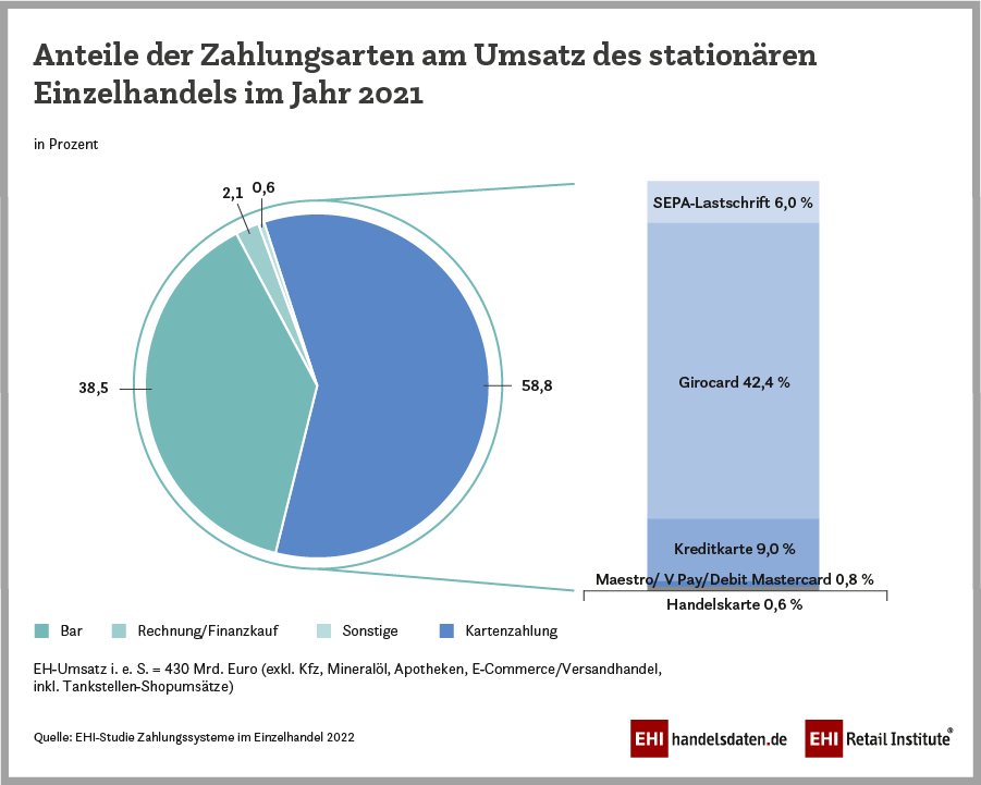 Das Bezahlverhalten der Kundschaft geht immer mehr in Richtung Kartenzahlung, wodurch ihr Umsatzanteil im stationären Handel seit 2019 von 50,5 Prozent auf 58,8 Prozent gestiegen ist. Der Transaktionsanteil der Karte hat von 26,1 Prozent auf 37,9 Prozent zugelegt.