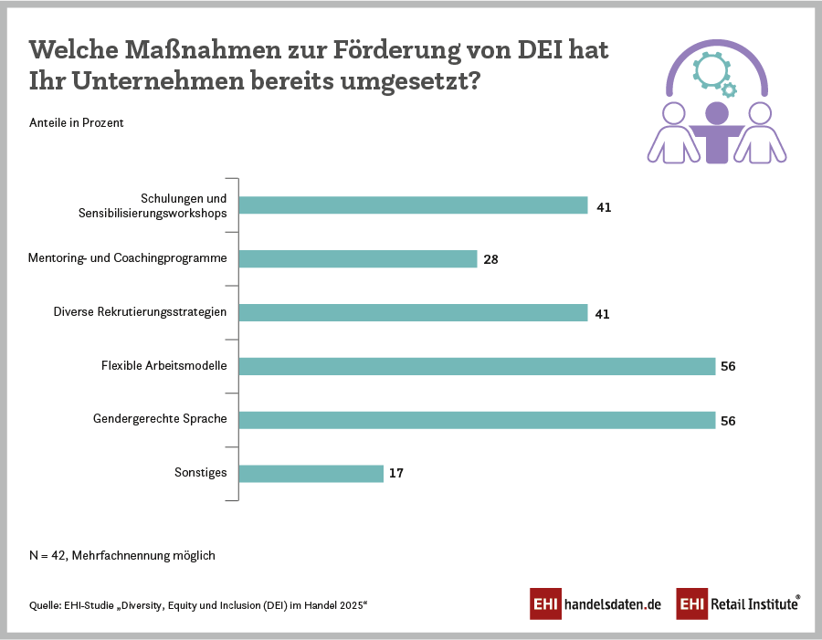 Hinsichtlich der Umsetzbarkeit dieser Maßnahmen ist der Handel vor allem bei flexiblen Arbeitszeiten und der gendergerechten Sprache (je 56 Prozent) weit fortgeschritten. Diverse Recruiting-Strategien und Workshops zum Thema setzen jeweils 41 Prozent um. Ein Problem dabei: 48 Prozent messen den Erfolg ihrer DEI-Maßnahmen bislang überhaupt nicht.