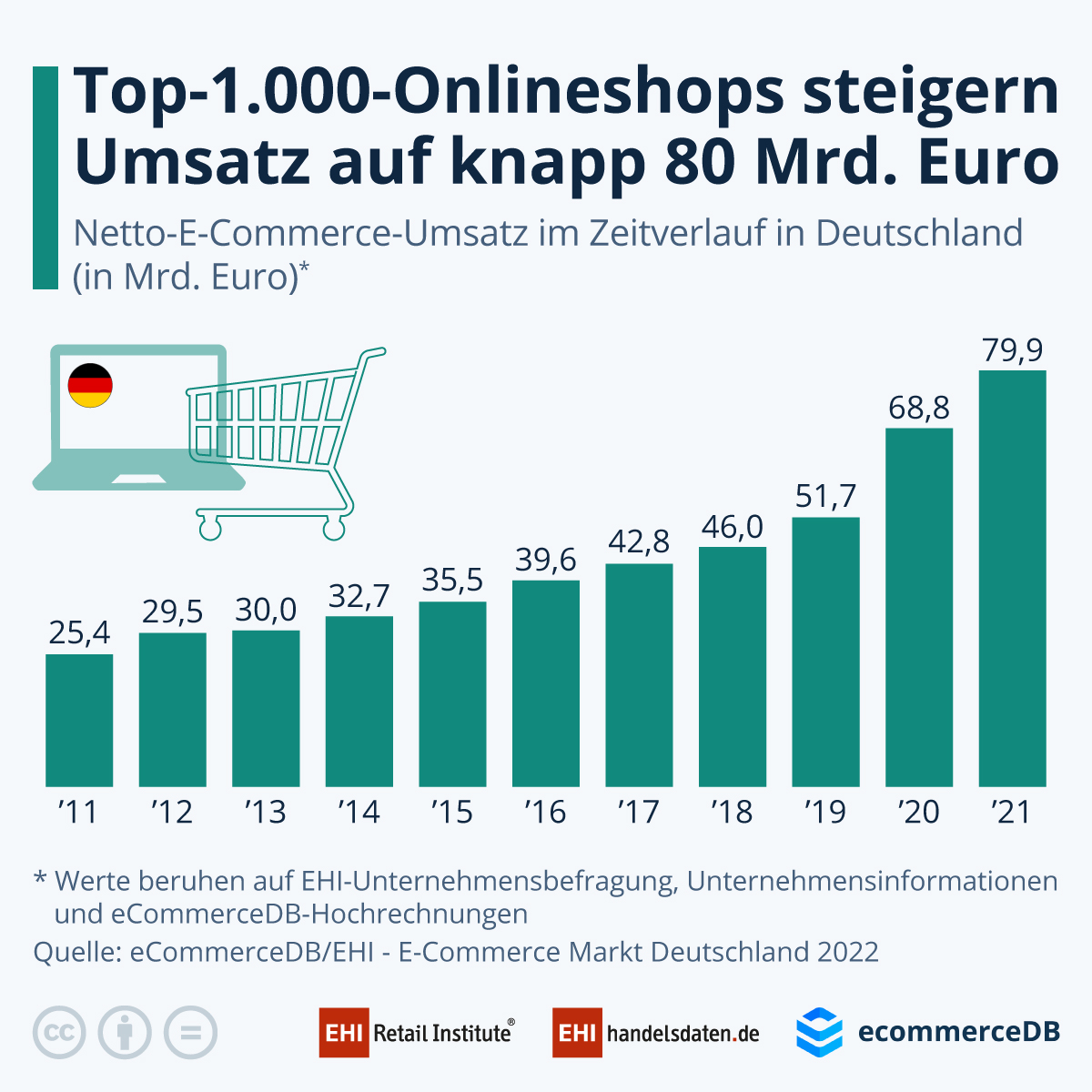 Die Angaben der Studie beruhen auf einer Händler-Befragung (EHI) und eCommerceDB-Hochrechnungen auf Basis einer Regressionsanalyse sowie Unternehmensangaben aus Geschäftsberichten, Pressemitteilungen sowie Unternehmenswebsites und ergänzt um Sekundärdaten. Schwerpunkt der Untersuchung waren B2C-Onlineshops sowie hybride B2C-Marktplätze für das Top-1.000er Ranking. Das Ranking basiert auf den Netto-E-Commerce-Umsätzen im Geschäftsjahr 2021. Komplementiert wird die Studie mit einer Liste ausgewählter B2C-Marktplätze, die aus reinen und hybriden B2C-Marktplätzen zusammengestellt wurde. Sie wird nach dem Bruttohandelsvolumen gelistet. Durch die permanente Anpassung der Umsatzmodellierung kommt es teilweise zu Veränderungen bei den Umsatzzahlen der modellierten Shops. Betreibt ein Unternehmen mehrere Onlineshops, so wurde jeder Shop separat betrachtet.