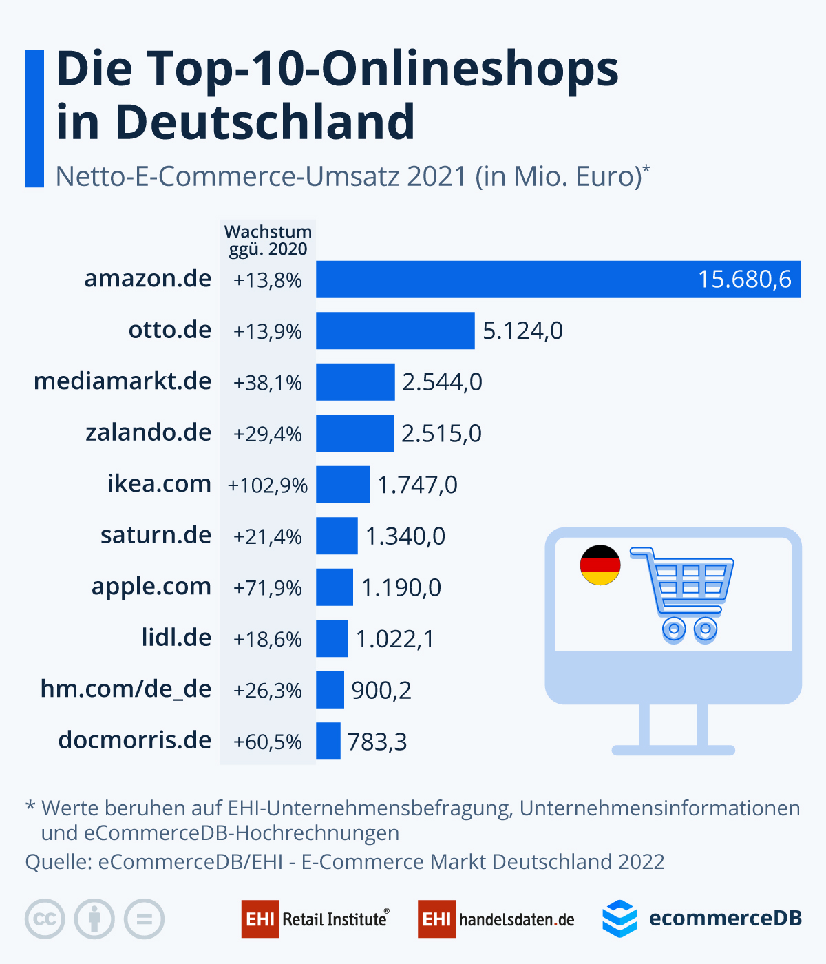 Insgesamt beträgt der Umsatz der Top-1.000 Onlineshops für das Jahr 2021 79,9 Mrd. Euro (2020: 68,8 Mrd. Euro). Das Ranking der umsatzstärksten Onlineshops führt erneut amazon.de mit einem E-Commerce-Umsatz von 15,68 Mrd. Euro an. Damit beansprucht der Marktführer mit 19,6 Prozent knapp ein Fünftel des Umsatzes der Top-1.000 für sich. Rang zwei belegt otto.de mit einem Umsatz von 5,12 Mrd. Euro. Die Top-3 komplettiert mediamarkt.de mit 2,54 Mrd. Euro.