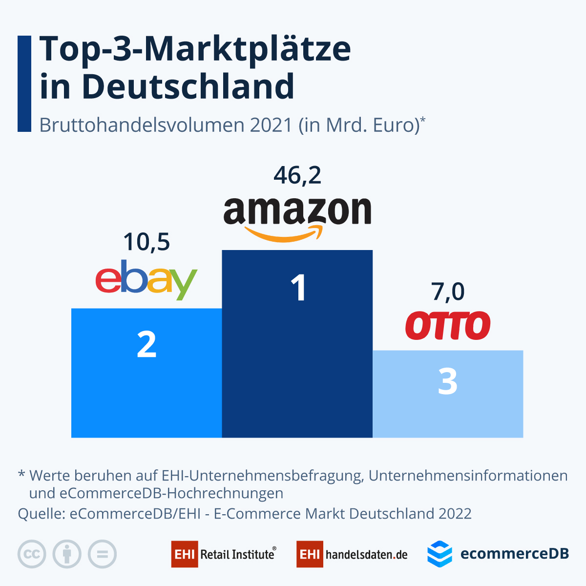 Die Liste der zehn ausgewählten reinen oder hybriden Marktplätze zeigt summiert ein geschätztes Bruttohandelsvolumen von 75,3 Mrd. Euro. Wie schon im Vorjahr gehören amazon.de (46,2 Mrd. Euro), ebay.de (10,5 Mrd. Euro) und otto.de (7,0 Mrd. Euro) auch im Geschäftsjahr 2021 zu den Top 3 Marktplätzen mit dem größten Bruttohandelsvolumen in Deutschland. Von den Top-1.000 Onlineshops verkauft ein großer Anteil seine Waren auch über Marktplätze. So haben 43,6 Prozent ein Shop-Profil auf Amazon, 35,1 Prozent auf Ebay und 13,6 Prozent auf Kaufland.