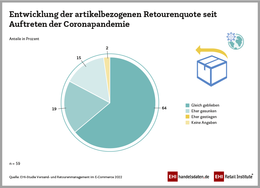 Während Corona, insbesondere während der pandemiebedingten Lockdowns, hat das Bestellaufkommen im Onlinehandel immens angezogen. Doch die naheliegende Vermutung, dass damit auch das Retourenaufkommen steigt, konnten die befragten Unternehmen kaum bestätigen. Nur 15 Prozent haben gestiegene Retourenquoten während der Pandemiezeit beobachtet. Von einem Rückgang berichten 19 Prozent. Bei Zwei Drittel der Teilnehmenden sei das Retourenaufkommen gleichgeblieben.