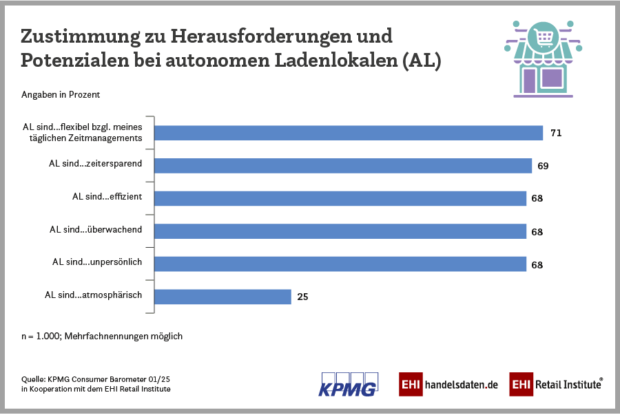 Autonome Ladenlokale könnten in den kommenden Jahren insbesondere im ländlichen Raum die Nahversorgung sicherstellen und den Auswirkungen des Rückgangs stationärer Geschäfte entgegenwirken. „Autonome Ladenlokale sind für den Handel nicht nur eine Antwort auf die aktuellen gesellschaftspolitischen Herausforderungen, sondern auch eine attraktive, mehrwertbringende Alternative für Kundinnen und Kunden. Gleichzeitig gilt es für Händler, bestehende kundenseitige Bedenken gezielt abzubauen“, erklärt Studienautor Dr. Tobias Röding vom EHI die Ergebnisse des neuen KPMG Consumer Barometers.