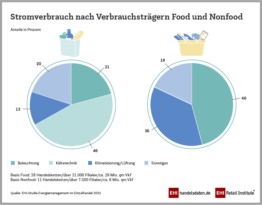 Im Food-Bereich verbraucht die Kühlung der Waren mit 46 Prozent den meisten Strom. 21 Prozent entfallen auf die Beleuchtung, 13 Prozent auf Klimatisierung und Lüftung. Unter „Sonstiges“ sind unter anderem Türen, Kassensysteme, Waagen und Fahrtreppen zusammengefasst, die zusammen 20 Prozent ausmachen. Im Nonfood-Bereich macht die Beleuchtung den größten Anteil aus (46 Prozent). Dahinter folgt die Klimatisierung (36 Prozent) und der sonstige Stromverbrauch (18 Prozent).