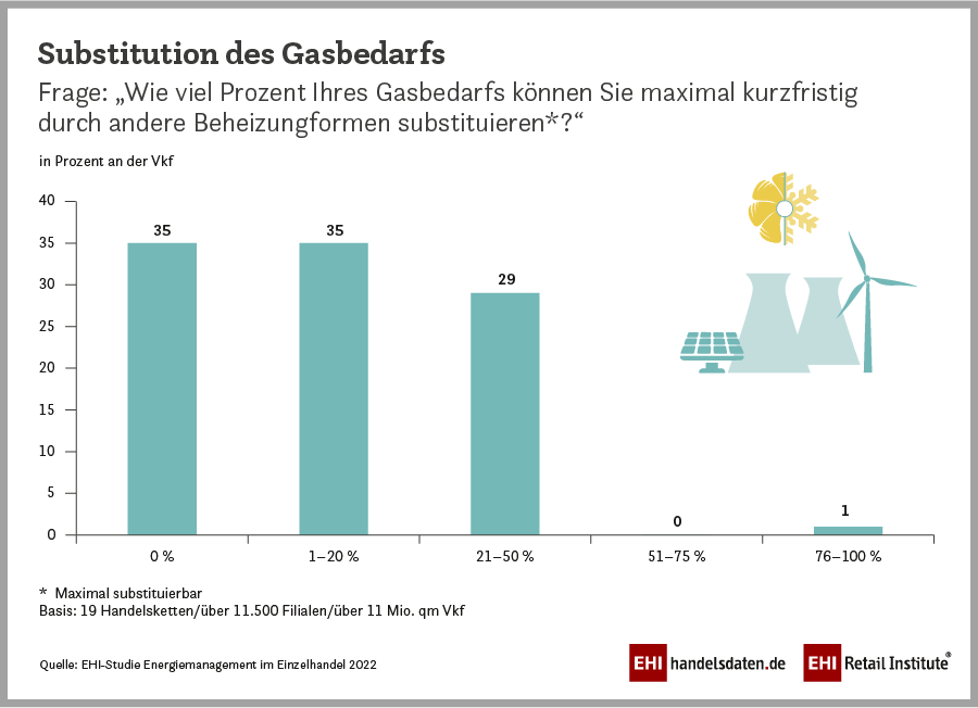 Für das teure Gas gibt es kaum kurzfristigen Ersatz: 35 Prozent der Händler geben an, dass sie ihren Gasbedarf kurzfristig durch keine andere Beheizungsform substituieren können. Weitere 35 Prozent schätzen den Gasbedarf, den sie schnell anderweitig ersetzen können, auf ein bis 20 Prozent. Dagegen können 29 Prozent bis zur Hälfte ihres Bedarfs kurzfristig durch alternative Beheizungsformen ersetzen.