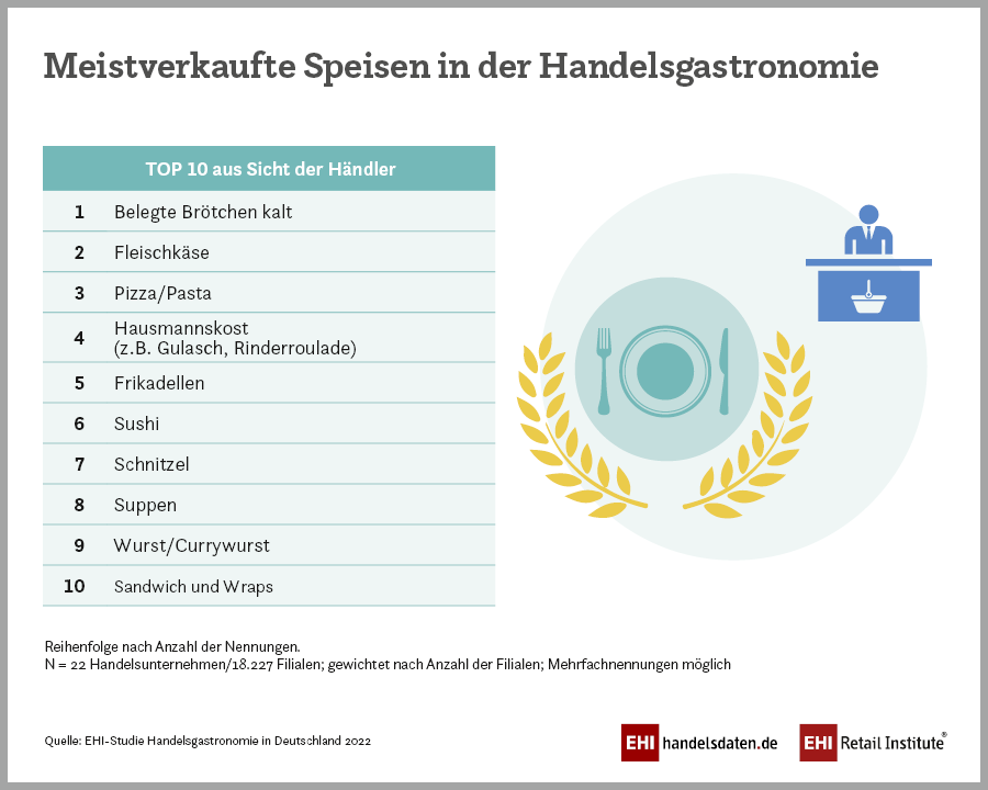 Mit Blick auf die Top-10 Speisen der Handelsgastronomie bleibt das belegte Brötchen weiter das meistverkaufte Produkt. Auf Platz zwei folgt der Fleischkäse vor italienischen Gerichten wie Pizza und Pasta. Im Umfeld der klassischen Gerichte hat sich die inzwischen etablierte Trendspeise Sushi auf Platz sechs im Ranking vorgearbeitet. Bei den meistverkauften Getränken stehen Softdrinks an erster Stelle gefolgt von Wasser und Kaffee.