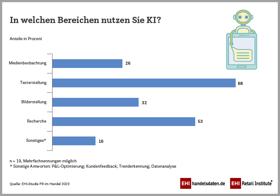 Künstliche Intelligenz (KI) ist in der Arbeitswelt angekommen – so auch bei den PR-Verantwortlichen im Handel. Wie die EHI-Studie „PR im Handel 2023“ zeigt, nutzen bereits mehr als 40 Prozent der befragten PR-Profis KI für ihre Kommunikation. „KI bringt vor allem Arbeitserleichterung und Zeitersparnis. Aber trotz vieler Vorteile sehen die Händler auch Gefahren, zum Beispiel durch Fake News oder mangelnde Transparenz“, sagt Ute Holtmann, Leiterin PR beim EHI. Im Social-Media-Bereich führt Instagram als meistgenutzter Kanal das Ranking an.