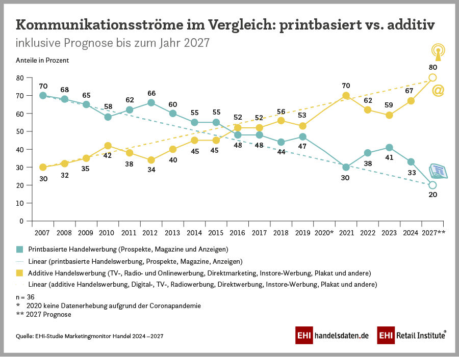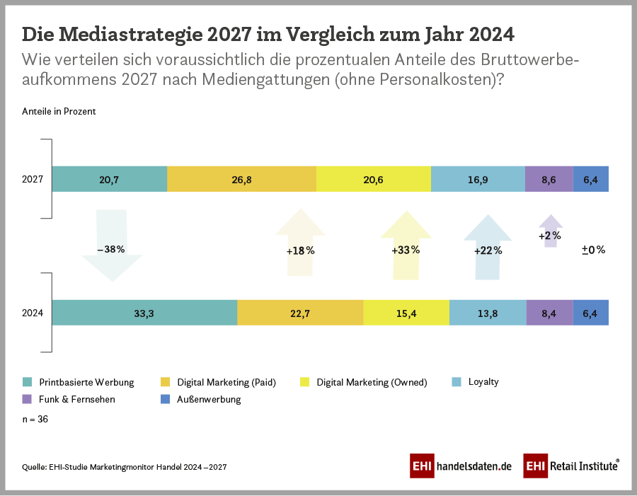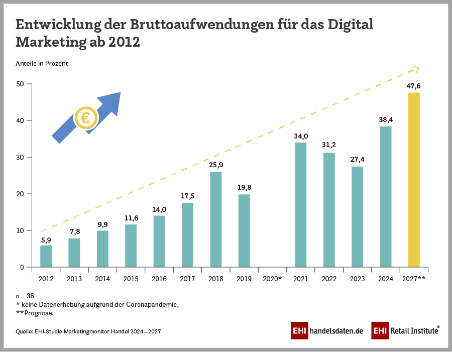 Die EHI-Studie „Marketingmonitor 2024 – 2027“ basiert auf einer Erhebung von Führungskräften aus dem Marketing von 36 deutschen Handelsunternehmen im Zeitraum von Juli bis August 2024. Die Handelsunternehmen erwirtschafteten zusammen einen Umsatz von 168 Mrd. Euro, etwa 20 Prozent des Gesamteinzelhandelsumsatzes, und betrieben rund 60.000 Filialen.