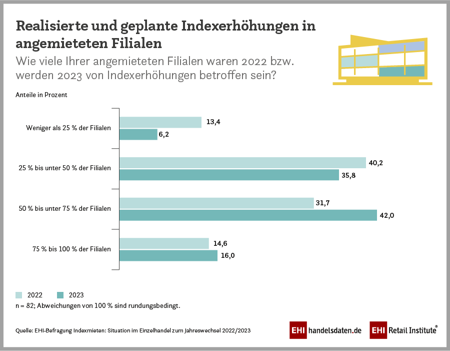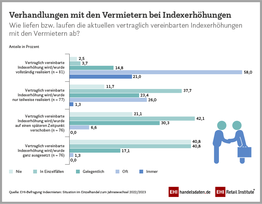 Indexmieten sind weit verbreitet. Sie richten sich nach dem sogenannten Verbraucherpreisindex*. Steigen die Verbraucherpreise, erhöhen sich auch die Mieten. Für die Vermieter – besonders in inflationären Zeiten – sind sie ein wichtiger Baustein zur Werterhaltung der Mietobjekte. Für die mietenden Unternehmen stellen sie hingegen aktuell eine erhebliche wirtschaftliche Belastung dar. Die derzeitige Inflation ist nicht auf eine steigende Nachfrage, sondern vor allem auf steigende Kosten zurückzuführen. Unter den jetzigen schwierigen Rahmenbedingungen werden daher die über viele Jahrzehnte hinweg üblichen und in jeder Hinsicht akzeptierten Indexklauseln vom Handel zunehmend kritisch gesehen. „In dieser außergewöhnlichen Situation sollten einige Vermieter etwas langfristiger denken“, erklärt ein Händler im Rahmen der EHI-Befragung.