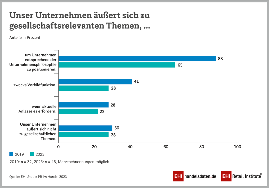 89 Prozent der befragten Unternehmen sind sich einig, dass sie gesellschaftliche Verantwortung tragen. Der Hauptgrund, sich zu gesellschaftsrelevanten Themen zu äußern, liegt mit 65 Prozent in der Positionierung ihres Unternehmens entsprechend der Unternehmensphilosophie. Außerdem sehen sie dies als Möglichkeit, gesellschaftliche Vorbildfunktion zu übernehmen. 28 Prozent der Unternehmen geben an, sich nicht zu gesellschaftlichen Themen zu äußern, um ihre Neutralität zu wahren, öffentliche negative Reaktionen zu vermeiden oder Kund:innen nicht zu verschrecken.