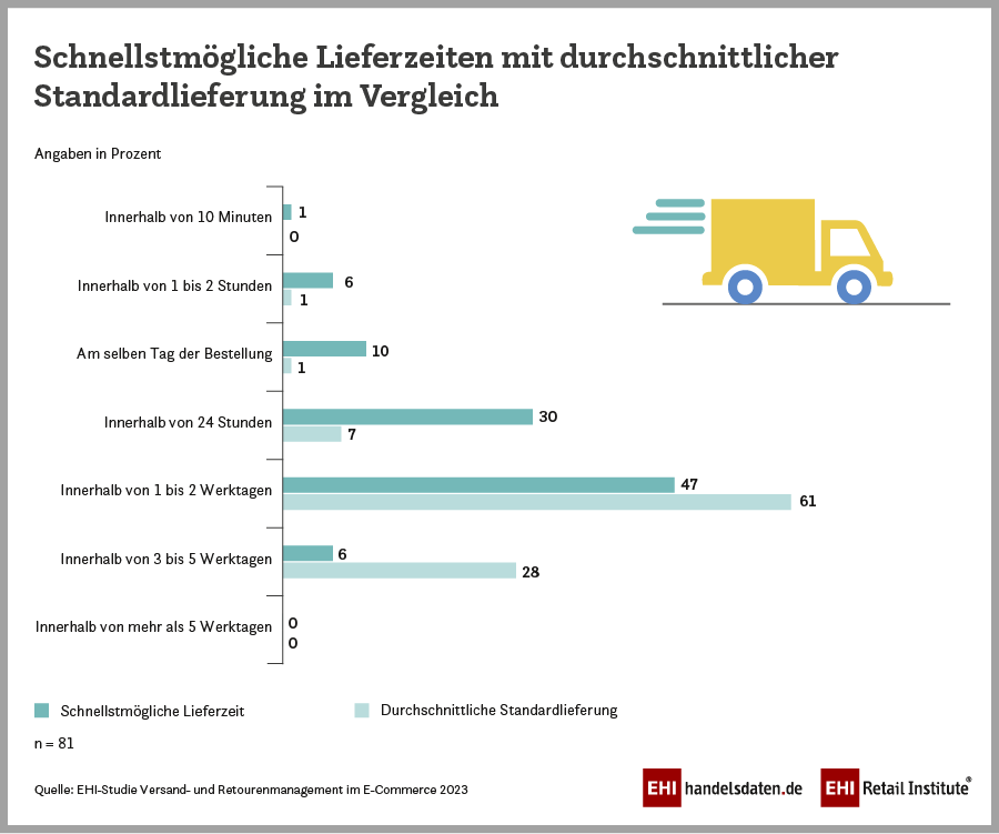 Für besonders schnelle Lieferzeiten nehmen die Händler teilweise einen Aufpreis. Als schnellstmögliche Lieferzeit gibt ein Unternehmen an, innerhalb von 10 Minuten zu liefern, sechs Prozent innerhalb von ein bis zwei Stunden und 30 Prozent innerhalb von 24 Stunden. 10 Prozent liefern noch am Tag der Bestellung. Fast die Hälfte (47 Prozent) können innerhalb von ein bis zwei Werktagen an die Kundschaft ausliefern. Bei sechs Prozent der Befragten handelt es sich bei der schnellstmöglichen Liefergeschwindigkeit um eine Versendung innerhalb von drei bis fünf Werktagen.