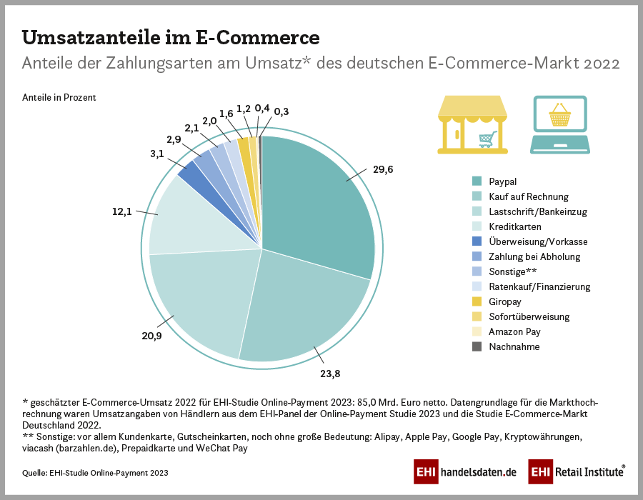 Die Studie „Online-Payment 2023“ wurde zwischen Februar und März 2023 mithilfe einer Online-Erhebung durchgeführt. Das Panel beinhaltet Daten von 138 Onlinehandelsunternehmen (Pureplayer und Omnichannel-Händler in Deutschland) unterschiedlicher Branchen und Umsatzgrößen mit einem Gesamtnettoumsatz in Höhe von 47,4 Mrd. Euro im Jahr 2022. Der E-Commerce Umsatz im Jahr 2022 wurde für die Berechnung der Umsatzanteile der Zahlungsarten auf 85 Mrd. Euro geschätzt. Datengrundlage für die Markthochrechnung waren Umsatzangaben von Händlern aus dem EHI-Panel der Online-Payment Studie 2023 und aus der EHI-Studie „E-Commerce-Markt Deutschland 2022“ sowie Daten der Branchenverbände bevh und HDE. Der geschätzte E-Commerce Umsatz für 2022 basiert auf Onlineshops, die physische Güter vertreiben (keine digitalen Güter oder Dienstleistungen), ist Retouren bereinigt, exkl. Umsatzsteuer und Marktplatzumsätze oder sonstige betriebliche Erträge des Unternehmens.