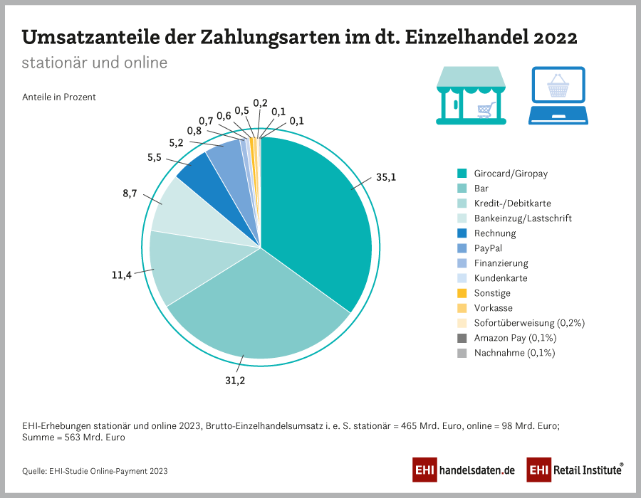 Der stationäre Handel hat in 2022 einen Bruttoumsatz* von rund 465 Mrd. Euro i.e.S. erwirtschaftet. Fast 80 Prozent davon wurde mit der Girocard (41,9 Prozent) oder bar (37,5 Prozent) bezahlt. Im E-Commerce kommen diese beiden Zahlarten kaum vor.