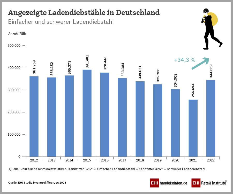 Mehr Diebstähle bedeuten automatisch auch mehr Anzeigen. Laut Polizeilicher Kriminalstatistik stiegen die angezeigten Ladendiebstähle im Jahr 2022 um 34,3 Prozent auf insgesamt 344.669 Fälle (Vorjahr: 256.694). Zuwächse gibt es sowohl beim einfachen (34,6 Prozent) als auch beim schweren Ladendiebstahl (29,6 Prozent). Allerdings waren die Anzeigen in den Corona-Jahren stark rückläufig, sodass trotz des enormen Anstiegs erst wieder das Niveau von 2019 erreicht ist. Aufgrund der hohen Dunkelziffer bildet die Statistik jedoch nur einen minimalen Ausschnitt der Realität ab, rechnerisch bleiben jährlich 21,2 Mio. Ladendiebstähle unentdeckt.