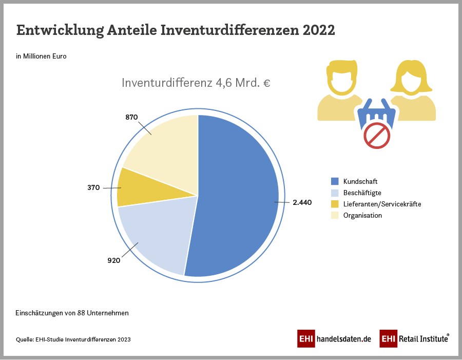 Im Vergleich zum Jahr 2021 sind die Inventurverluste im zurückliegenden Jahr 2022 von 4,1 auf 4,6 Mrd.* Euro gestiegen, was einer Zunahme von 12 Prozent entspricht. Ein großer Teil davon ist inflationsbedingt entstanden. Zudem ist zu berücksichtigen, dass der stationäre Umsatz von 430 auf 465 Mrd. Euro gestiegen ist. Die Inventurdifferenzen setzen sich nach Expertenschätzungen aus Diebstahl durch die Kundschaft (2,44 Mrd. Euro), Diebstahl durch Beschäftigte (920 Mio. Euro), Diebstahl durch Servicekräfte und Liefernde (370 Mio. Euro) sowie organisatorischen Mängeln (870 Mio. Euro) zusammen. Der Verlustanteil durch Diebstahl legt um 15 Prozent auf insgesamt 3,73 Mrd. Euro zu (2021: 3,23 Mrd. Euro).