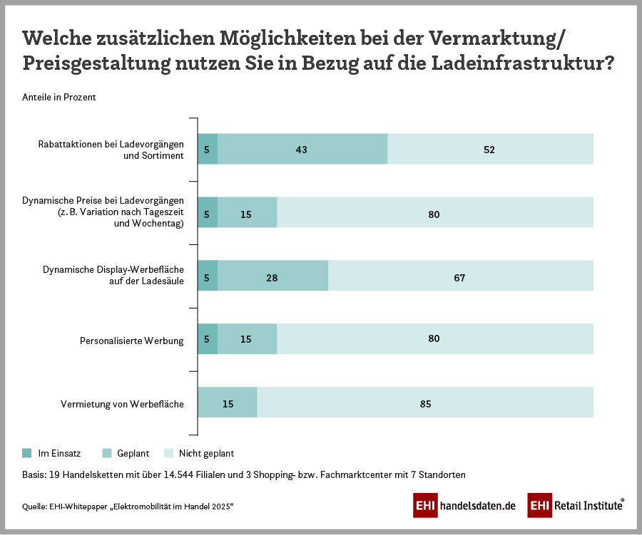 Noch nutzt die Kundschaft das Angebot nicht übermäßig. Im Durchschnitt sind die Normalladepunkte knapp die Hälfte der Zeit belegt. Bei DC-Ladern sind es 34 Prozent und bei HPC-Ladern ein Viertel der Zeit, an denen die Ladepunkte in Benutzung sind. Um diese Rate zu steigern und durch die Ladestationen für Umsatzsteigerungen im Ladengeschäft zu sorgen, gibt es noch großes Potenzial. So bieten die Händler Rabattaktionen auf Ladevorgänge und Sortiment eher selten an (5 Prozent), allerdings planen 43 Prozent dies für die Zukunft. Auch für Personalisierung und zusätzliche Werbefläche an den Ladepunkten gibt es Planungen.