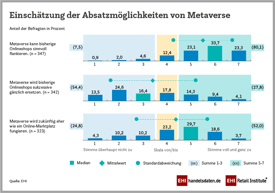 Nach Ansicht der Händler eignet sich Metaverse als gute Ergänzung zu Onlineshops. Für über 80 Prozent kann es Onlineshops sinnvoll flankieren. Dass es die bisherigen Onlineshops gänzlich ersetzen kann, denken nur 27,8 Prozent. Vielmehr ist Metaverse für 52 Prozent als Online-Marktplatz vorstellbar. In ihren Antworten schildern mehrere Teilnehmende, Metaverse könne als Bindeglied die physischen und virtuellen Welten wechselseitig erweitern und neue Omnichannel-Erlebnisse schaffen.