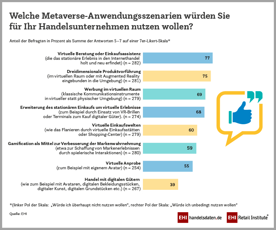 Im Metaverse würden mit 77,3 Prozent die meisten der befragten Händler auf die virtuelle Beratung zurückgreifen. 75,4 Prozent würden ihre Produkte dreidimensional präsentieren und 69,2 Prozent würden im virtuellen Raum auch Werbung schalten. Auch einer Erweiterung des stationären Einkaufs um virtuelle Erlebnisse durch VR-Brillen steht der Handel positiv gegenüber (67,9 Prozent).