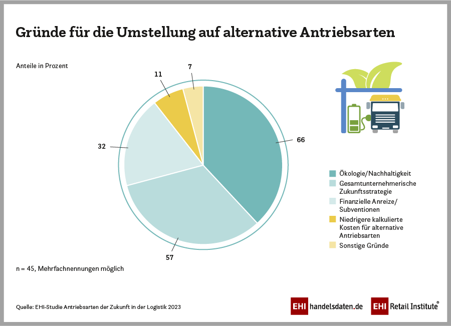 Besonders die mangelnde Reichweite mit 53 Prozent, die Höhe der Investitionskosten mit 47 Prozent und die schlechte Lade- und Tankinfrastruktur mit 44 Prozent werden am häufigsten als Gründe gegen einen Umstieg genannt. Zusätzlich nennen die Befragten die fehlende Verfügbarkeit auf dem Beschaffungsmarkt beziehungsweise zu lange Lieferzeiten der Hersteller sowie mangelnde politische Unterstützung. Außerdem wird der derzeitige Stand der Technik aufgeführt.