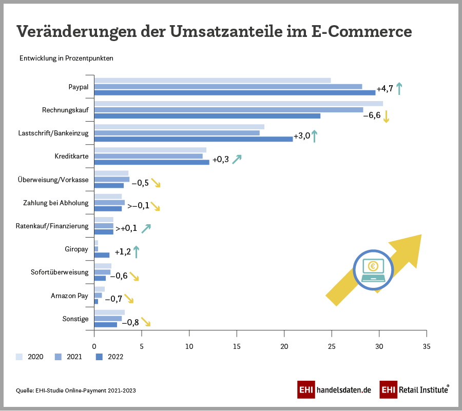 Beim Online-Shopping bezahlt die deutsche Kundschaft am liebsten mit Paypal. Der Online-Bezahldienst hat den Kauf auf Rechnung – die hierzulande seit Jahren führende Zahlungsart – im Jahr 2022 bei den Umsatzanteilen im E-Commerce erstmalig überholt. „Das Bezahlen mit Paypal ist für die Kundschaft schnell und bequem, für Händler allerdings nicht ganz preiswert. Paypal wird im Handel fast überall angeboten und bietet die Möglichkeit, Einkäufe erst nach 30 Tagen zu bezahlen“, erläutert Studienautor Radoslav Raychev die Ergebnisse der EHI-Studie „Online-Payment 2023“. Insgesamt beträgt der geschätzte E-Commerce-Nettoumsatz für das Jahr 2022 85 Mrd. Euro. Damit ist der Umsatz im Vergleich zum Vorjahr (86 Mrd. Euro) u.a. aufgrund wieder geöffneter Geschäfte leicht rückläufig.
