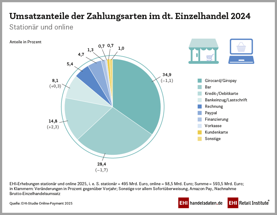 28,5 Prozent der Online-Einkäufe wurden 2024 mit Paypal bezahlt. Das sind 0,8 Prozentpunkte mehr als 2023. Der Kauf auf Rechnung erreichte im vergangenen Jahr 25,8 Prozent (2023: 26,7 Prozent). Danach folgen das Lastschriftverfahren/Bankeinzug mit 17,3 Prozent (2023: 16,7 Prozent) und die Kredit- bzw. internationalen Debitkarten mit 12,3 Prozent (2023: 11,4 Prozent).
