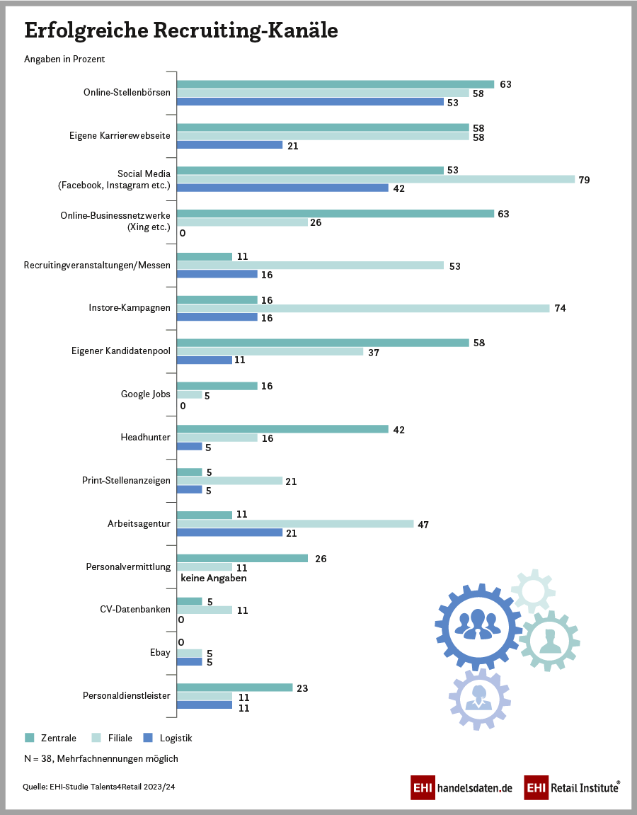 Um dem Arbeitskräftemangel bestmöglich zu begegnen, greifen Unternehmen auf die unterschiedlichsten Recruiting-Kanäle zurück, die die Stellenbesetzung leichter gestalten. Social Media wird von den Arbeitgebern für Stellen in der Zentrale (53 Prozent), Filiale (79 Prozent) oder in der Logistik (42 Prozent) eingesetzt. Noch erfolgreichere Recruiting-Kanäle für die Zentrale sind Onlinebörsen und Businessnetzwerke (63 Prozent) sowie die Karriereseite und der eigene Kandidatenpool (58 Prozent). Für Filialen sind es auf dem zweiten Platz Instore Kampagnen (74 Prozent) und auf dem dritten Platz Onlinebörsen und Karriereseiten.