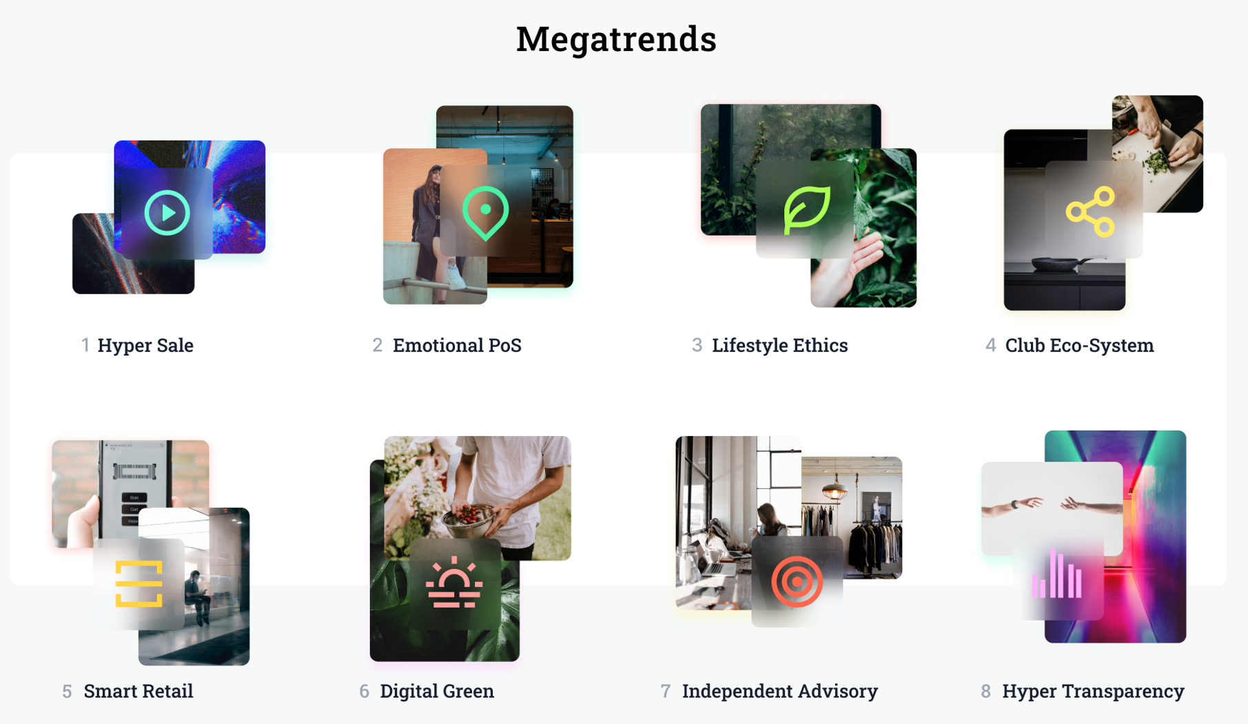 Beim „Club Eco-System“ bilden zielgruppenorientierte Händler-Netzwerke emotionale Partnerschaften zu ihrer Kundschaft auf und gewährleisten einen umfassenden Austausch von Kundendaten. Marken und Händlerwahl sind dabei Teil des Lebensgefühls. Das Netzwerk etabliert eigene, exklusive Kanäle und wird damit zu einer datengetriebenen Tech-Plattform, die virtuelle Kundenwelten, Live-Experience und Retail Media vereint.