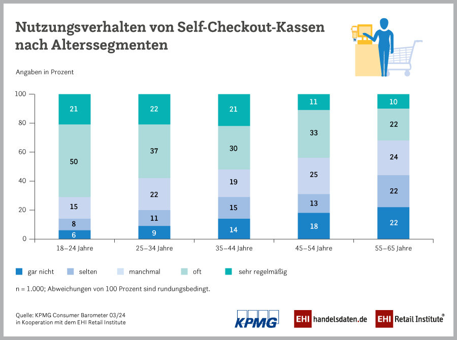 Innovative Technologie im stationären Einzelhandel optimiert Prozesse und wirkt sich positiv auf das Einkaufserlebnis aus. Ein Beispiel hierfür sind sogenannte Self-Checkout-Kassen (SCO-Kassen). Sie werden zwar noch häufiger von jüngeren Kundinnen und Kunden genutzt, aber auch ältere Menschen erkennen zunehmend die Vorteile. Dies wird insbesondere im Hinblick auf die Integration von Künstlicher Intelligenz in SCO-Kassen z.B. zur Altersverifizierung oder für personalisierte Rabatte deutlich, wie das aktuelle Consumer Barometer von KPMG in Deutschland „Technologien im Einzelhandel: der autonome Kassenprozess“ in Kooperation mit dem EHI zeigt.