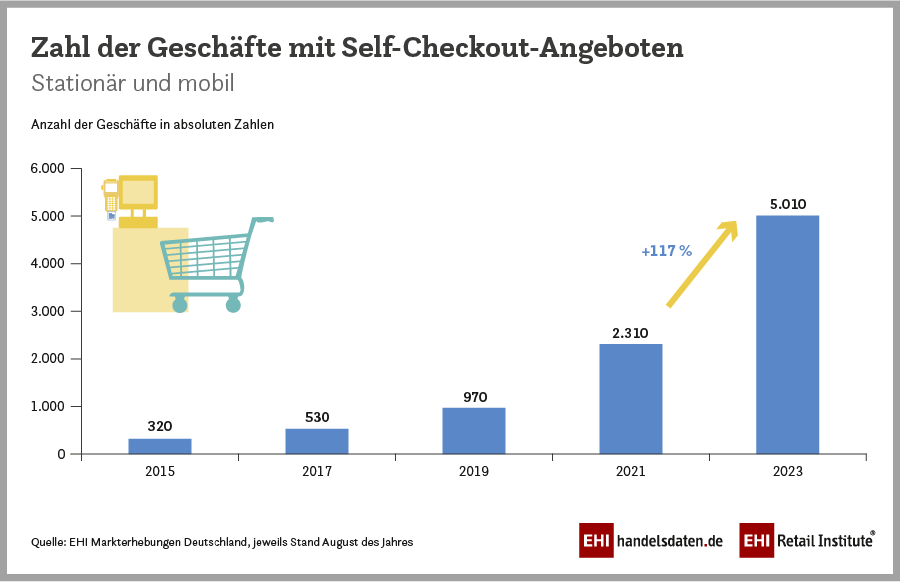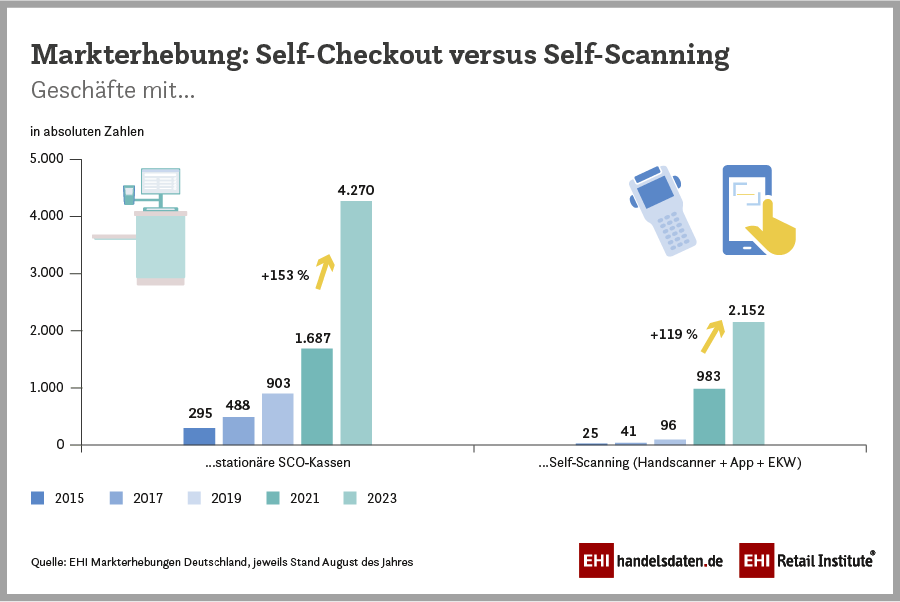 „Die gute Kundenakzeptanz von Self-Checkout- und teilweise auch Self-Scanning-Systemen wird sicherlich dazu führen, dass in naher Zukunft weitere Unternehmen ihrer Kundschaft diesen Service anbieten werden“, erklärt Frank Horst, Leiter der EHI-Initiative Self-Checkout und Experte für Inventurdifferenzen beim EHI und prognostiziert: „Das Marktangebot an stationären Self-Checkout-Kassen wird weiterwachsen. Eine ähnliche Dynamik ist im Bereich des mobilen Self-Scannings per Handscanner und per Einkaufswagen zu erwarten.“ Allein in den Jahren 2021 bis 2023 ist die Anzahl der Geschäfte, die mobile oder stationäre Self-Checkout-Systeme anbieten, von 2310 auf 5010 gestiegen. Das entspricht einer Steigerung von 117 Prozent.
