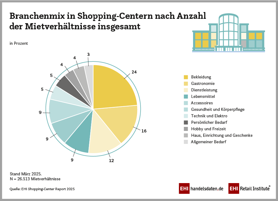 Der Handel übernimmt neben seiner Funktion als Versorger der Bevölkerung auch immer mehr die Funktion als Entertainer. So sind Erlebniskonzepte und auch Gastronomie inzwischen essenzielle Bestandteile von Shopping-Centern. „Revitalisierungen von Shopping-Centern sorgen dafür, dass diese relevant für die Lebenswelt der Menschen bleiben“, erklärt Lena Knopf, EHI-Expertin und Autorin des Shopping-Center-Reports. „Insofern ist deutlich mehr Bewegung im Markt als man beim reinen Blick auf die Anzahl der Center vermuten könnte.“