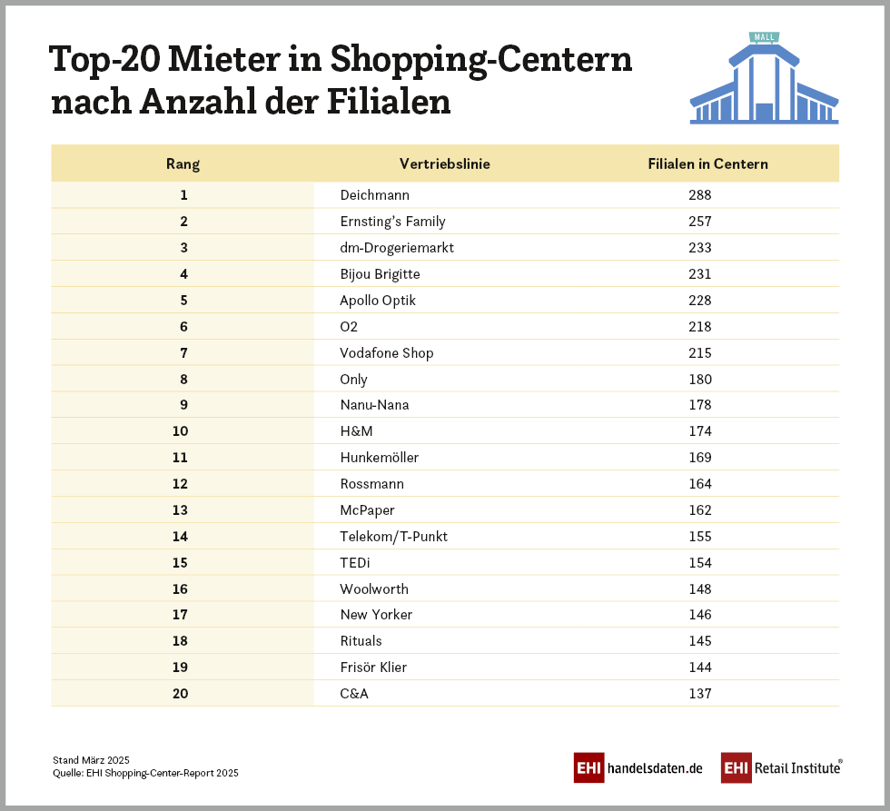 Es gibt weiterhin sieben Vertriebslinien, die über mehr als 200 Filialen in Shopping-Centern verfügen; die Reihenfolge der Top Drei bestehend aus Deichmann (288 Filialen in Centern), Ernsting’s Family (257) und dm-Drogeriemarkt (233) ist unverändert. Danach haben sich ein paar Verschiebungen ergeben. So haben o2 mit 218 Filialen (- 15 im Vergleich zum Vorjahr) und Vodafone mit 215 Geschäften (- 8) ihre Filialnetze in Shopping-Centern etwas ausgedünnt, befinden sich aber weiterhin unter den Top Ten. Douglas (- 5) ist knapp nicht mehr in den Top 20 vertreten, Depot nach der Insolvenz und starker Ausdünnung des Filialnetzes ebenfalls nicht mehr. Die zwei Neuzugänge Tedi (+ 14 Filialen) und Woolworth (+ 27 Filialen) legen ein intensives Tempo bei der Expansion (nicht nur) in Shopping-Centern vor.