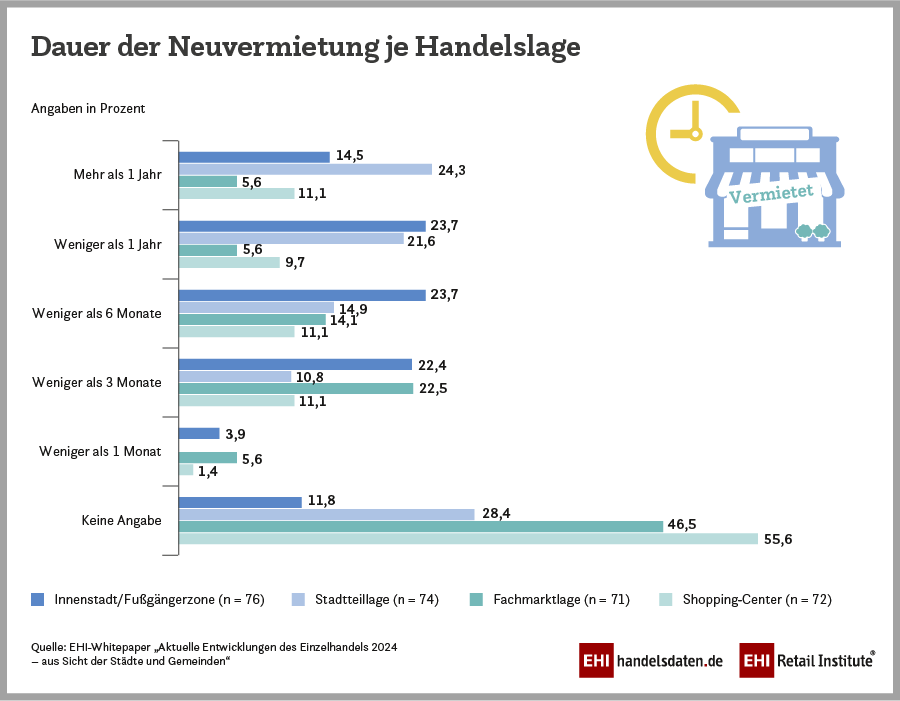 Drei Viertel der Ladenflächen in Innenstädten werden innerhalb weniger als eines Jahres wieder neu vermietet, bei der Hälfte passiert dies sogar innerhalb von sechs Monaten oder schneller. Die größten Probleme bei der Neuvermietung haben dagegen Ladenlokale in Stadtteillagen. Hier beobachtet nur ein Viertel der befragten Städte eine Dauer von sechs Monaten oder weniger. Neuvermietungsdauern von einem Jahr und mehr sind keine Seltenheit.