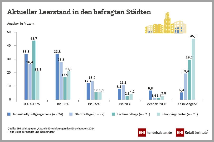Betrachtet man die unterschiedlichen Lagen der Geschäfte – Innenstädte, Stadtteilzentren, Shopping-Center und Fachmarktzentren – schneiden letztere am positivsten ab. Sie verzeichnen die geringsten Rückgänge und die größten Zuwächse. Nur sieben Städte (10 Prozent) beobachten einen Leerstand von über 10 Prozent in den Fachmarktlagen. Rund zwei Drittel der befragten Städte schätzen den Leerstand in ihren Innenstadtlagen auf maximal 10 Prozent, etwas mehr als die Hälfte schätzt den Leerstand in Stadtteilen auf bis zu 10 Prozent. Bei Shopping-Centern schätzen rund 42 Prozent der Städte den Leerstand auf maximal 10 Prozent, aber 13 Prozent gehen von mehr als 10 Prozent aus.